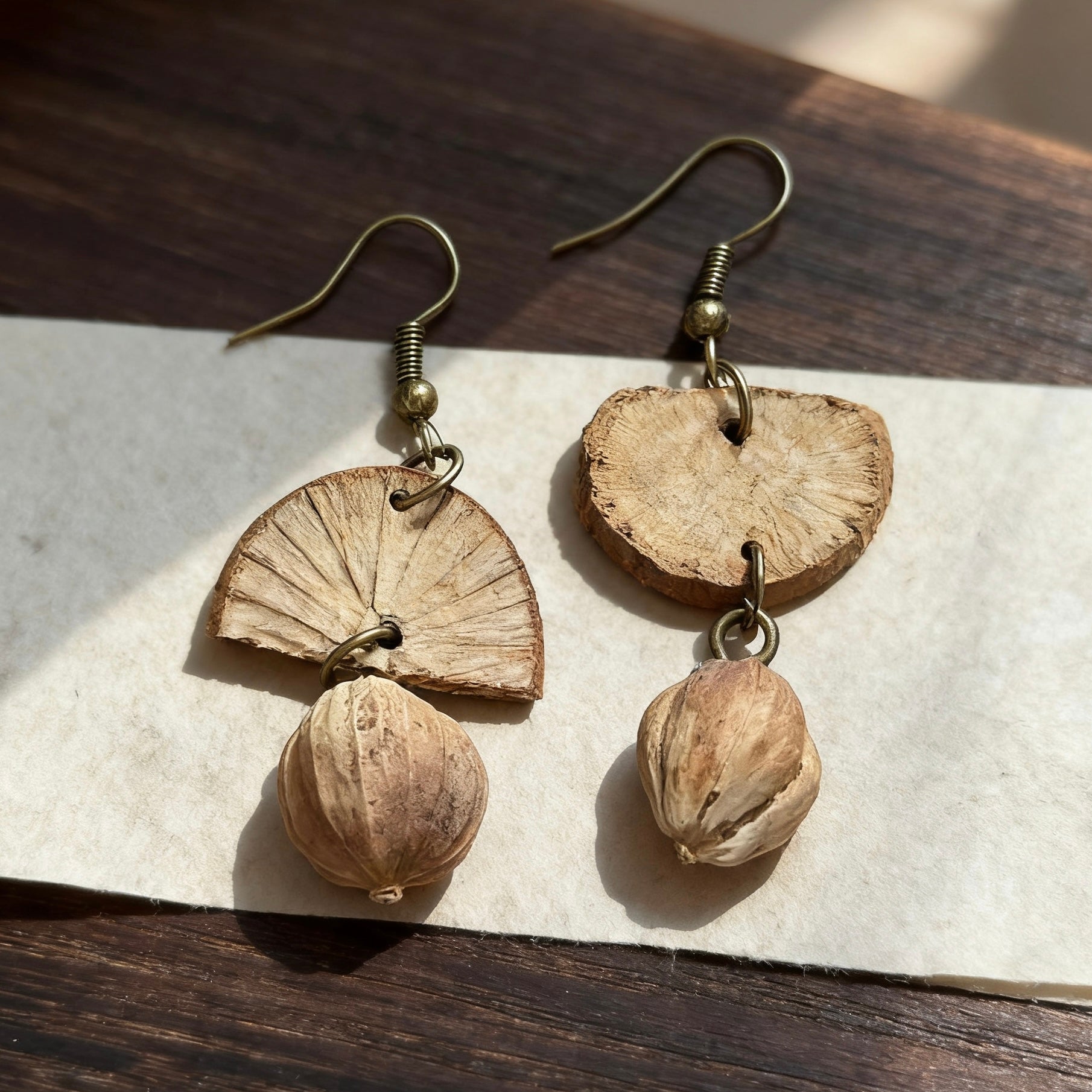 Each earring features a delicate betel nut slice, preserved with its raw fan-shaped texture and gradient hues of earthy brown and cream. Paired with a smooth, rounded cardamom pod, the composition is elegantly connected by an antique bronze-finish hook—hypoallergenic and subtly echoing the organic warmth of the materials. Every piece tells a unique story through nature’s untouched imperfections.