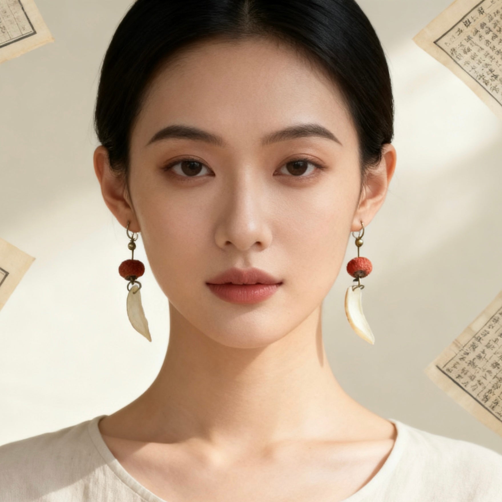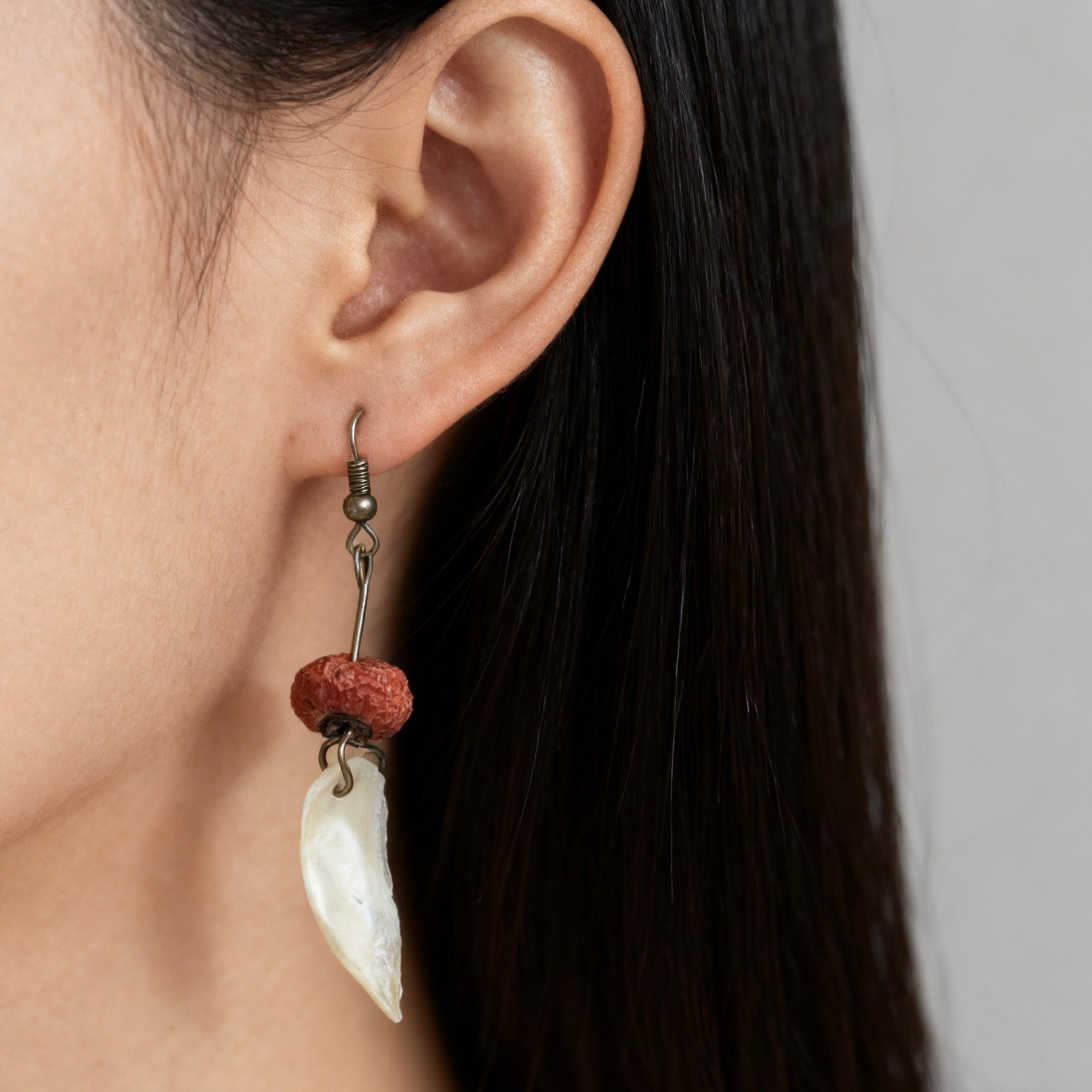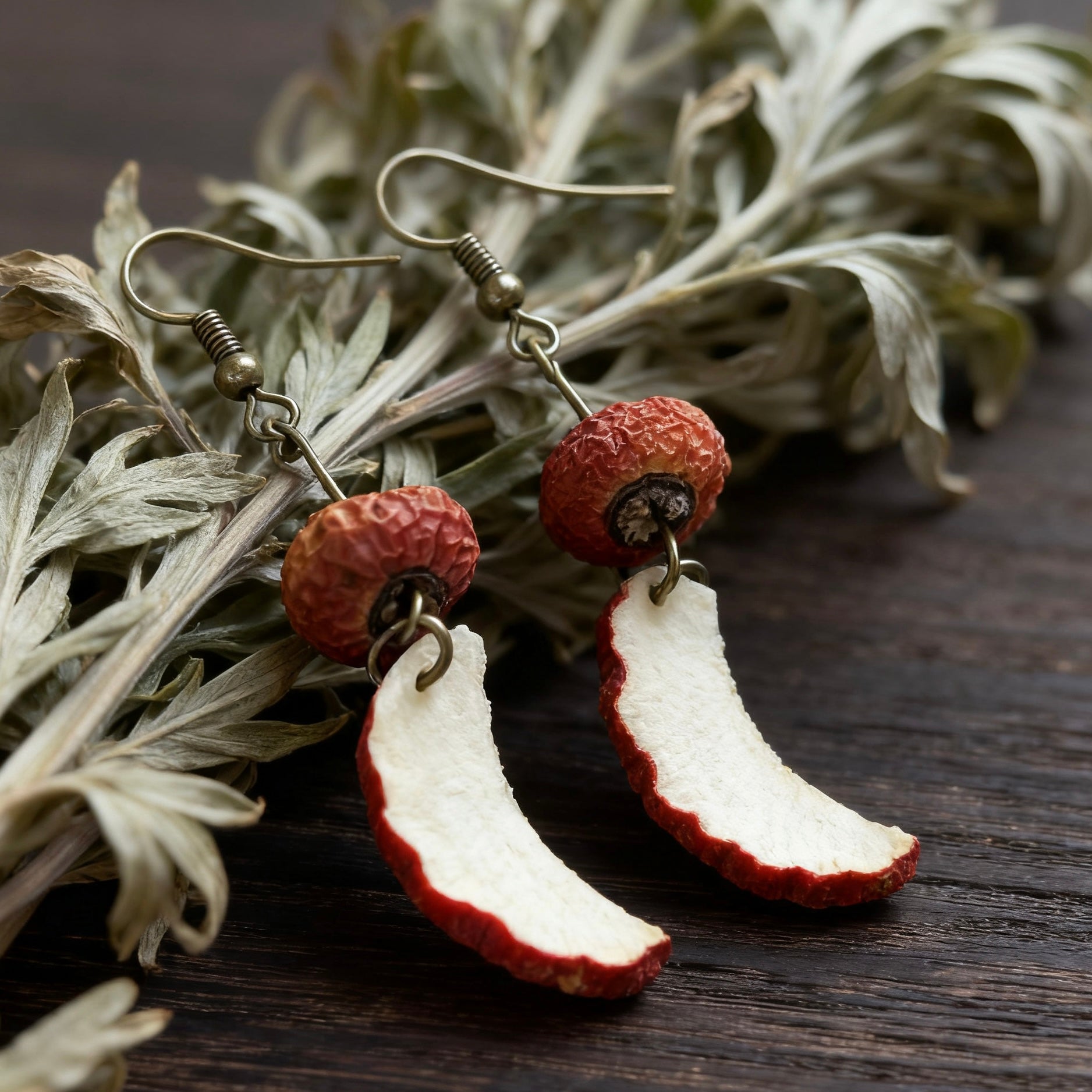 A dialogue between wildness and elegance: vibrant rose hips and delicate dried lily calyxes suspended from antique brass hardware. Each piece captures the untamed beauty of nature’s cycle, designed for free spirits who wear their poetry on ears.